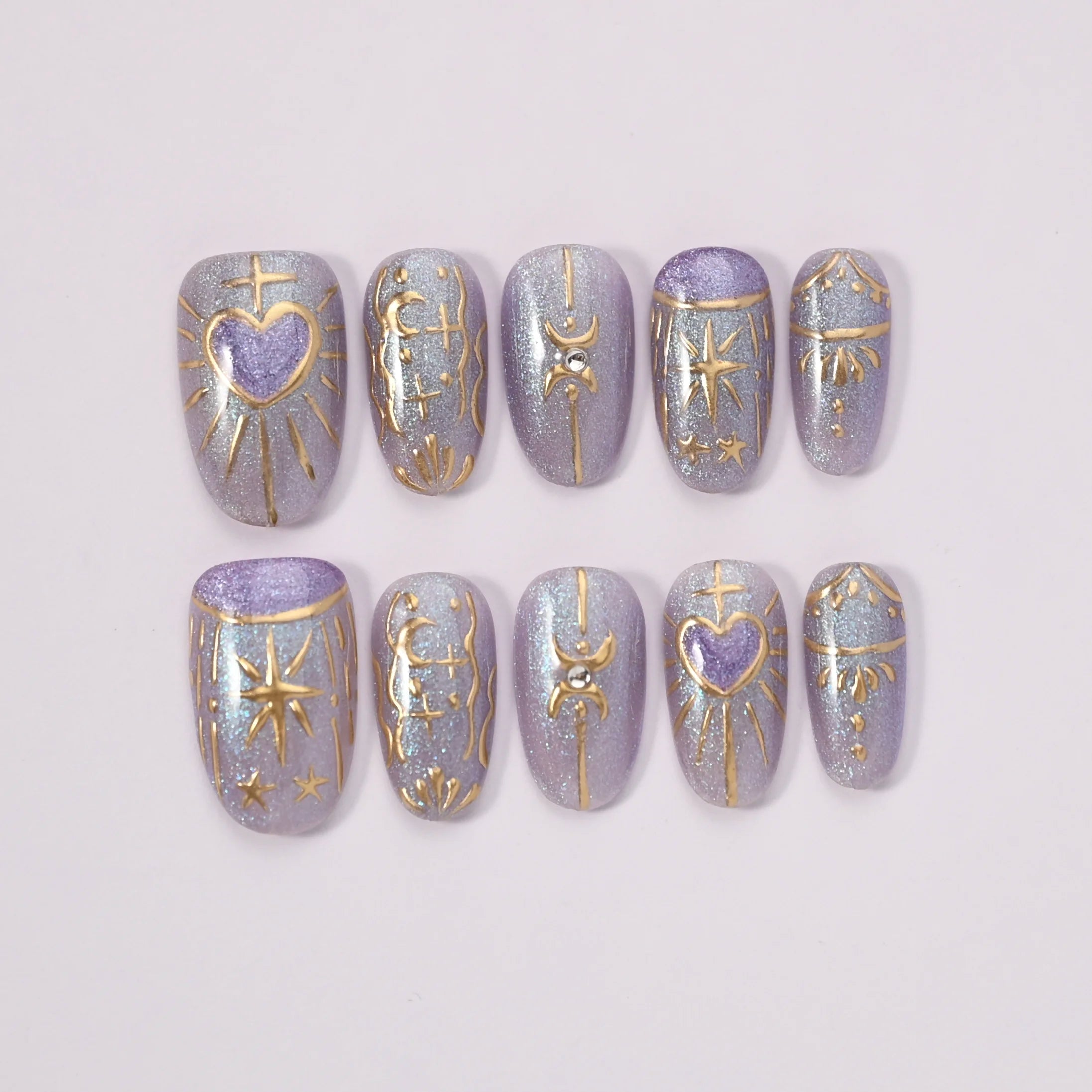 Blubella Magia Stellata press-on nails viola argento con cristalli stellari e effetto aurora boreale - nail art celestiale premium per matrimoni ed eventi speciali