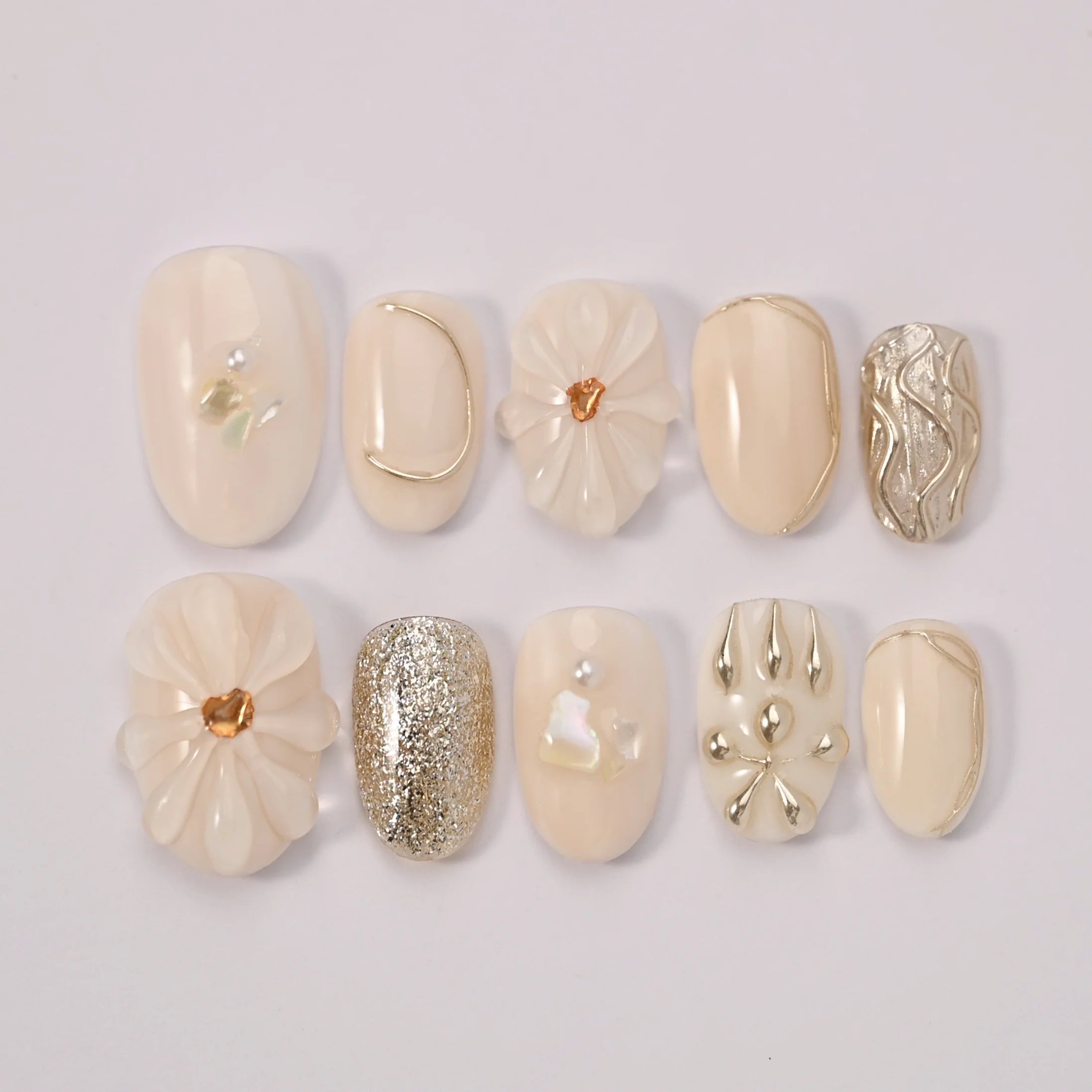 "Ivory Flowers" by Blubella Nails represents timeless elegance, combining classic elements with modern details for a sophisticated and romantic look.