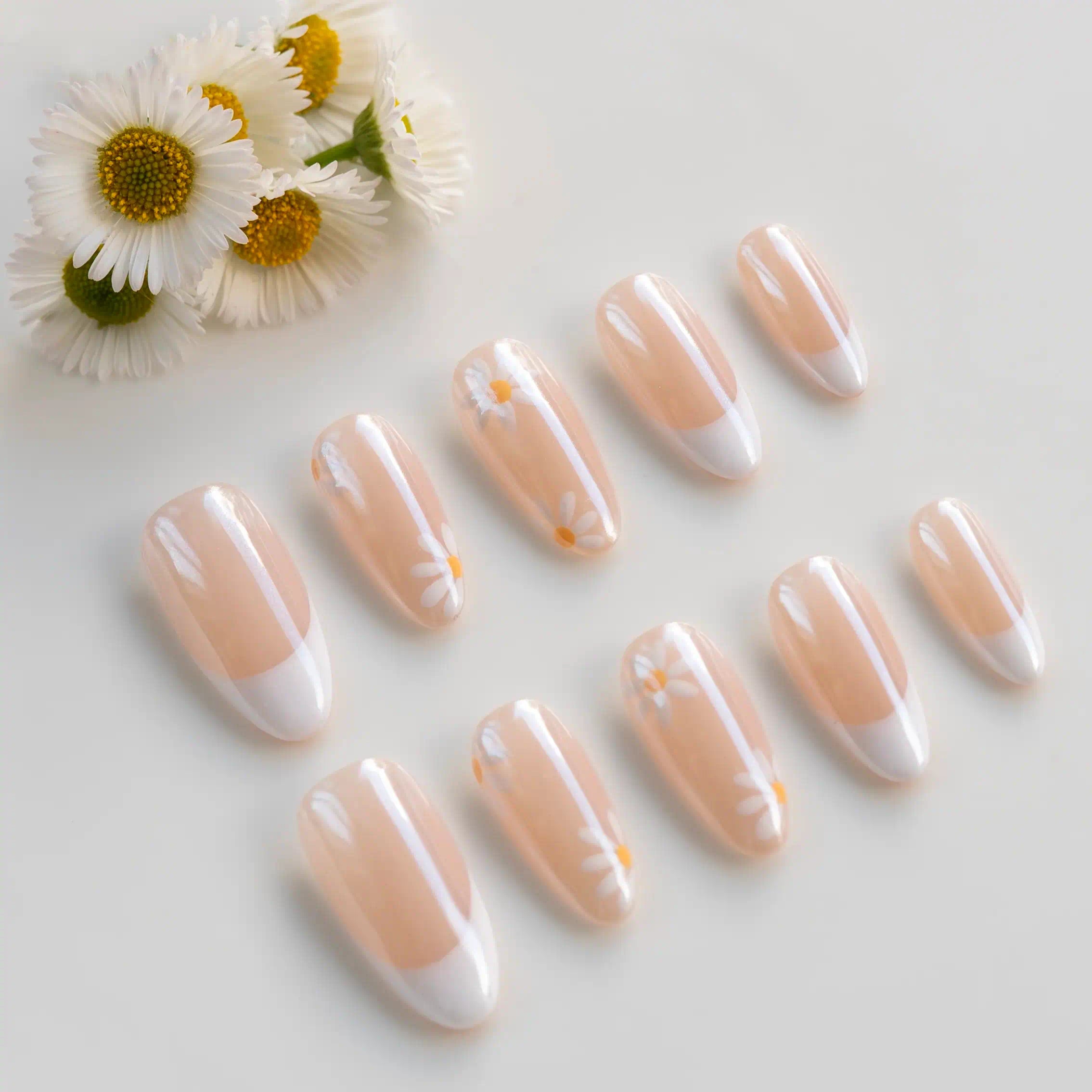 The "Daisy Delicate" press-on nails are a masterpiece of artisanal nail art. Each daisy is meticulously hand-painted by our artists, combining the delicacy of the French tip with romantic floral decorations.